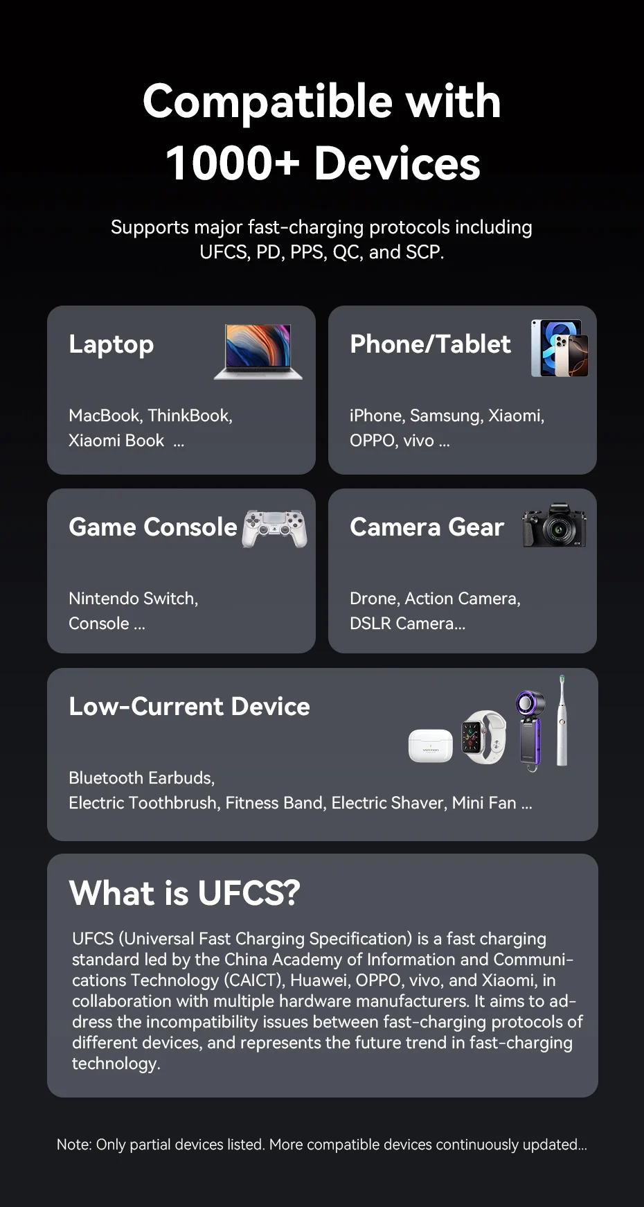 Supports major fast-charging protocols including UFCS, PD, PPS, QC, and SCP.