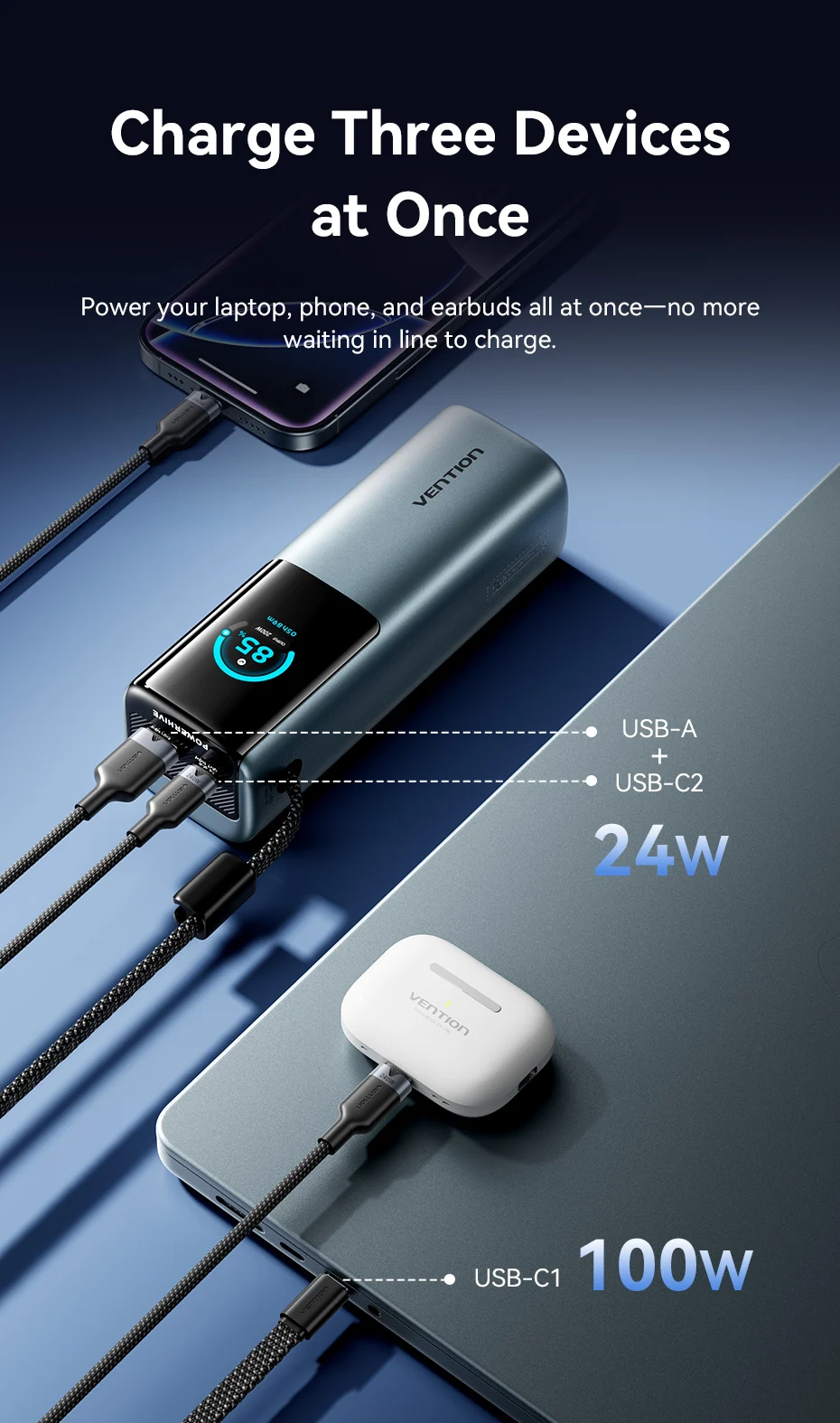 Power your laptop, phone, and earbuds all at once—no more waiting in line to charge.