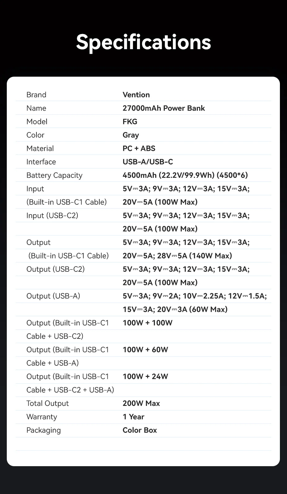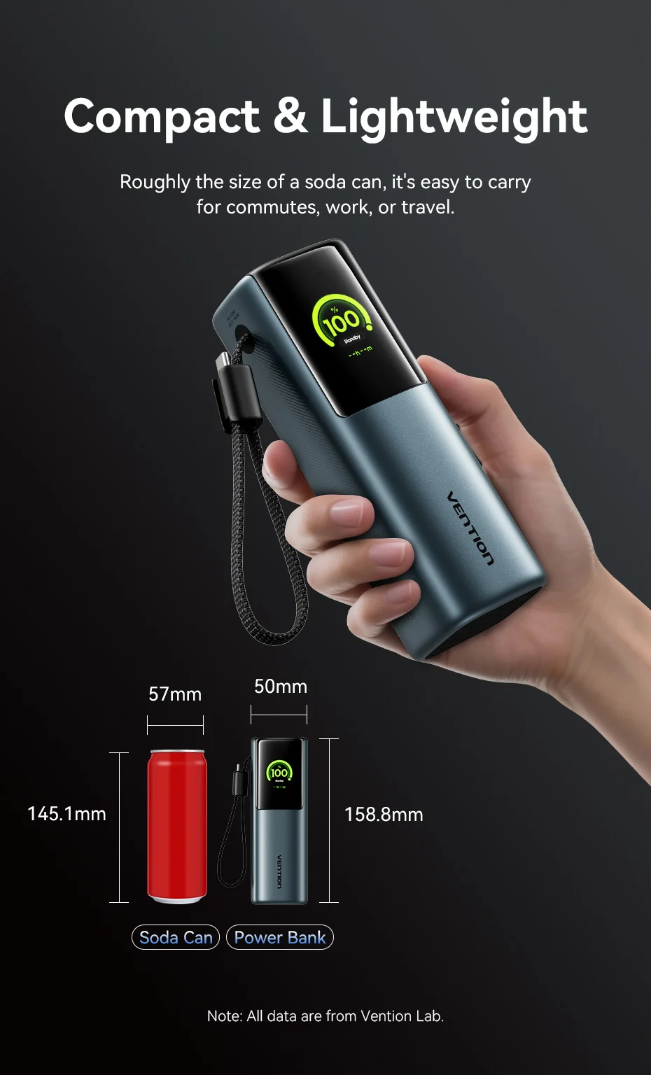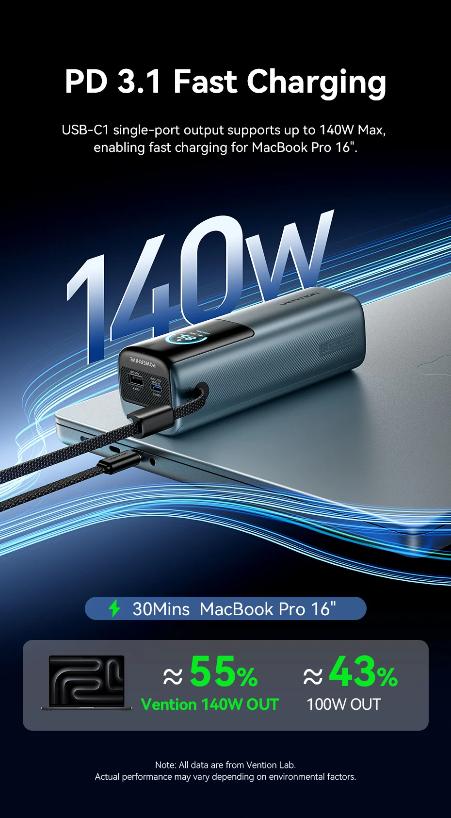 Vention 140W Power Bank 27000mAh PD 3.1 200w Max Portable PowerBank for Laptop Xiaomi Macbook Pro Fast Charge External Battery